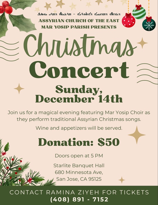 Join us for a magical evening featuring Mar Yosip Choir as they perform traditional Assyrian Christmas songs.